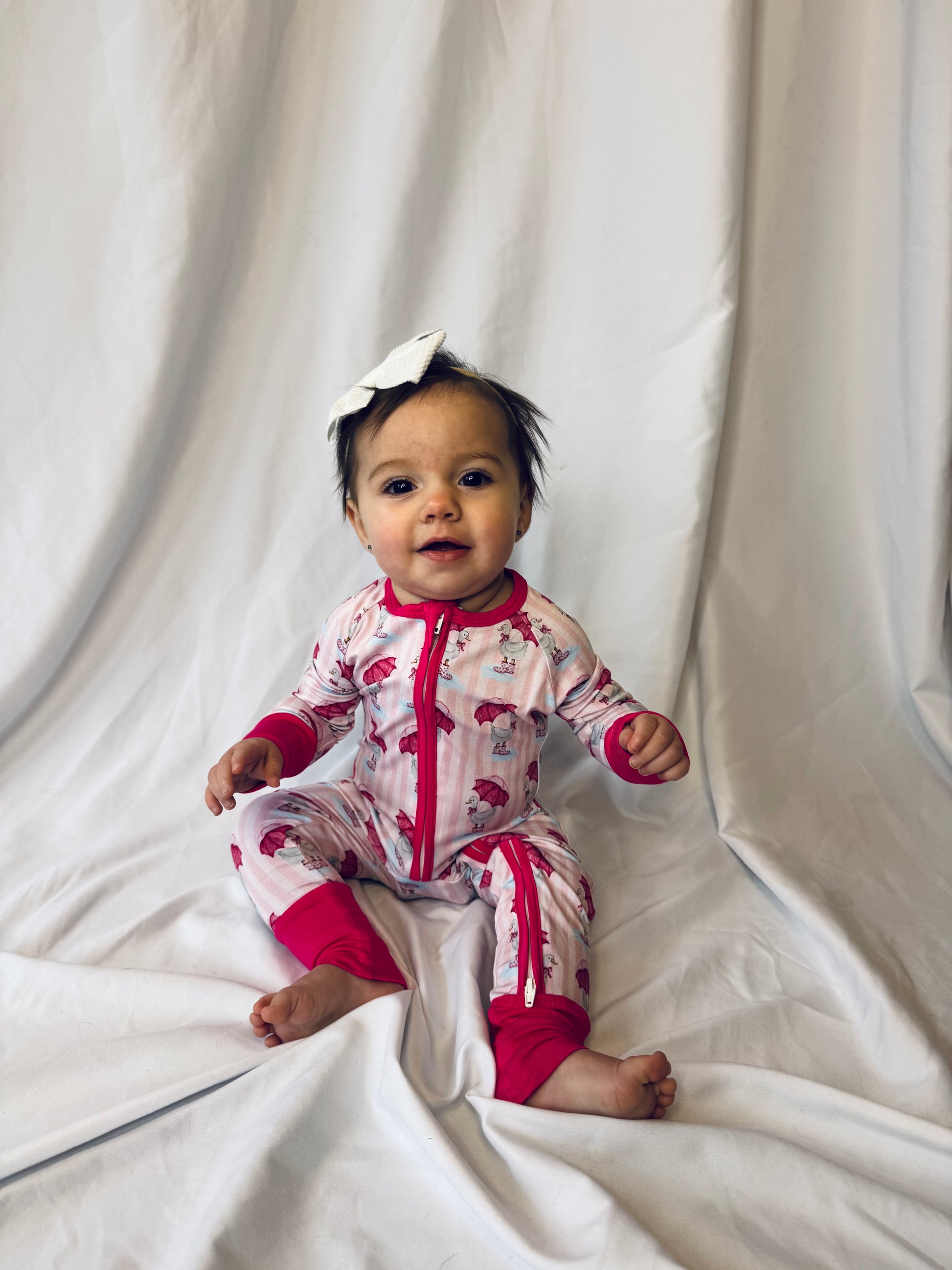 Our Pink Puddle Ducks bamboo pajamas feature the most adorable duckies splashing through puddles with pink umbrellas and bows, set against a soft blush striped background. This whimsical print brings cozy rainy-day vibes to bedtime and beyond.